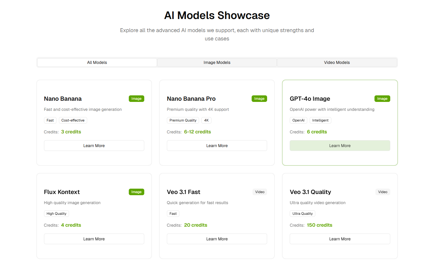 | AI Best is a comprehensive AI image and video generation platform that empowers creators to generate stunning visuals with ease. The platform supports five core functionalities: Text to Image, Image to Image, Image Editing, Text to Video, and Image to Video, powered by 9+ advanced AI models including Nano Banana, Nano Banana Pro, GPT-4o Image, Flux Kontext, Veo 3.1 Fast, Veo 3.1 Quality, Sora 2, Sora 2 Pro, Kling 2.6, and Wan 2.5. Users can generate high-quality images in seconds and create professional videos from text or images. The platform features a flexible credit-based payment system with monthly subscriptions starting from $12/month, yearly plans with 46% savings, and one-time credit packs. With support for multiple aspect ratios, resolutions, and formats, AI Best caters to content creators, designers, marketers, and businesses looking to enhance their creative workflows with cutting-edge AI technology. |